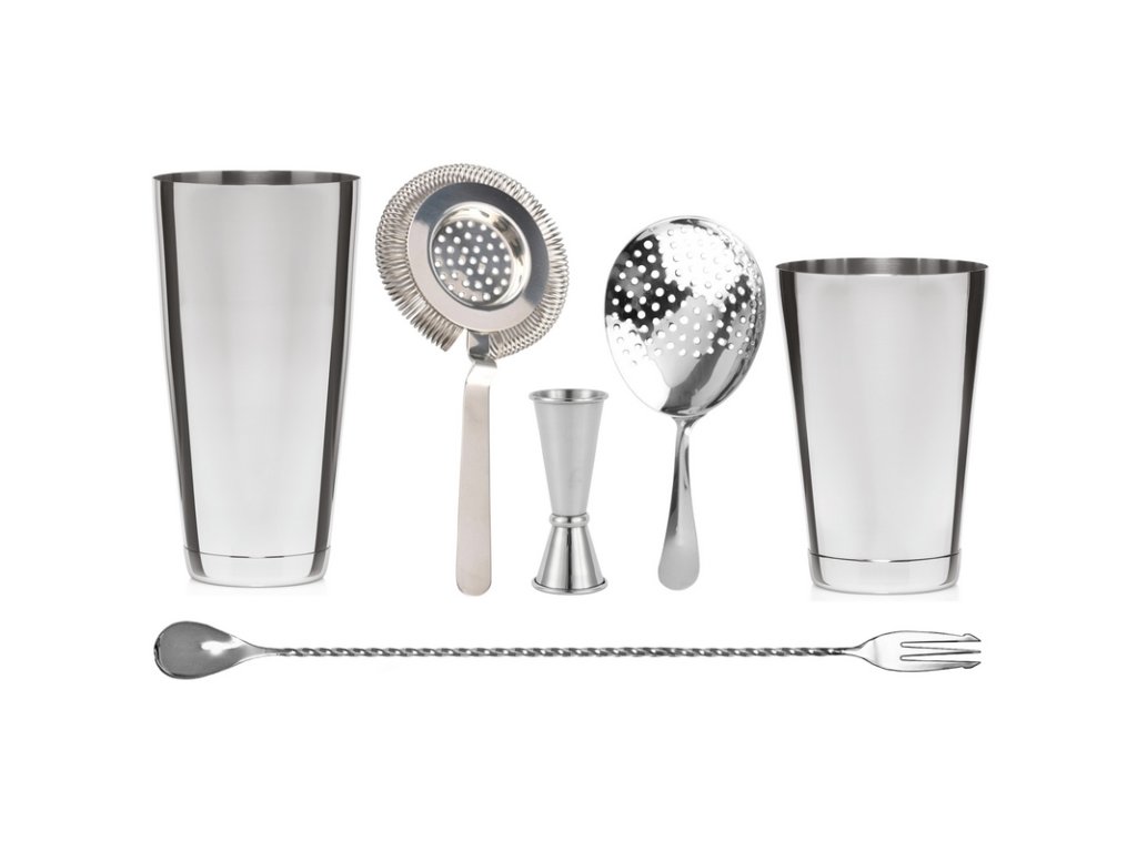 Barmanská sestava ve stříbrné barvě se hodí do každého baru pro přípravu míchaných drinků a jiných nápojů.Set obsahuje: