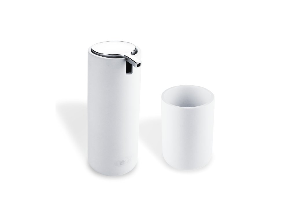 Dávkovač na tekuté mýdlo s pohárkem Set s dávkovačem na mýdlo a pohárkem na kartáčky. Objem 175 ml. Barva bílá. Materiál polyresin.Doplňkové parametry