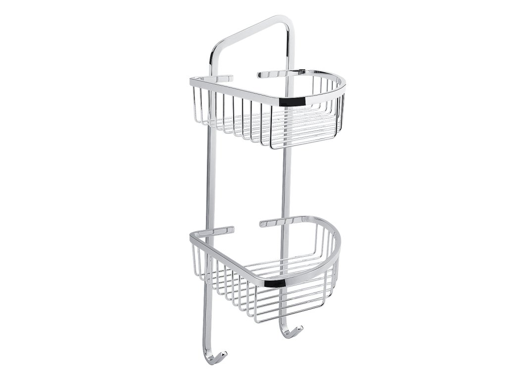Dvoupatrová drátěná rohová polička do koupelny s háčky je skvělým doplňkem do koupelny. Opusťte konvenční tvary a vsaďte na osobitý styl! I zařízení koupelny o vás mnohé vypoví. Současné trendy se stále stáčejí k využívání chladného kovu a hran. Drátěná rohová police OPEN nabízí sladění moderních prvků i nadčasovosti. Vzdálenost mezi šrouby cca 24,50cm.Doplňkové parametry