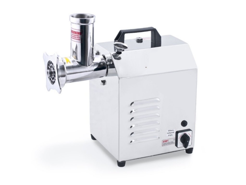 Elektrický mlýnek se skvěle hodí na mletí masa. Snadno seodpojuje a čistí. V sestavě motorová jednotka a mlýnek. Mlýnek – mlecí šnek, posunovač, dvě mlecí síta o průměru 6 a 8 mm. Otočný nůž z nerezové oceli.Elektrický mlýnek na maso