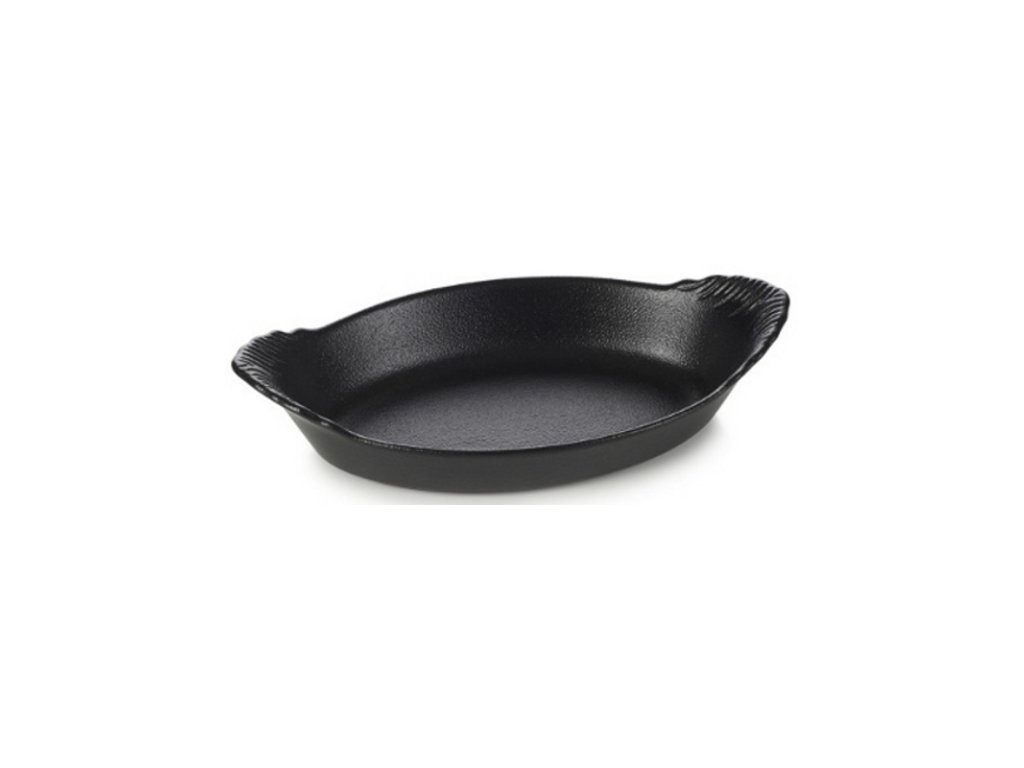 Tato forma ve stylu černé rytiny, která jí dodává intenzivnější krásu, skvěle poslouží pro servírování vašich kulinářských děl. Dvě rukojeti zajišťují jednodušší manipulaci. Vyrábí se z kvalitního porcelánu šikovnými ručičkami Francouzů, a dodává tak nádobí odolnost a dlouhotrvající výdrž, navíc ho lze mýt v myčce nádobí i užívat v troubě, mikrovlnce a ledničce. Její jednoduchý, ale přesto elegantní design umocňuje gastronomický prožitek.Forma oválná s ušima 20 × 11 × 4 cm, tmavě šedá