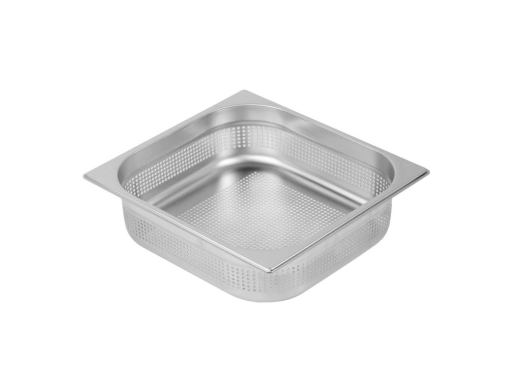 Děrovaná gastronádoba z řady Profi se díky svému všestrannému využití a vysoké kvalitě rychle stane nepostradatelným pomocníkem v každé profesionální kuchyni. Můžete v ní vařit, smažit, ohřívat i vydávat pokrmy. Dá se také použít k napařování zeleniny nebo na přípravu jídla v konvektomatu až do teploty 300 °C. Po stranách najdete úchyty, které vám usnadní manipulaci. Nádoba se vyrábí z nerezové oceli 18/10 (18 % niklu, 10 % chromu), která garantuje její vysokou odolnost, dlouhou životnost a dovoluje ji umýt v myčce.Gastronádoba Profi děrovaná s úchyty GN 2/3 150 mm