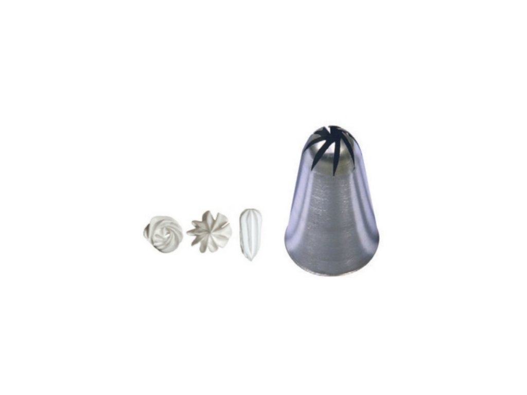 Nerezová koncovka do tvaru růže je perfektní k precizní práci při zdobení krémem různých zákusků, dezertů, ale i jiných delikates. Má trvalé značení pro snadnou identifikaci velikosti trysky a přizpůsobí se všem typům cukrářských sáčků. Díky odolnému materiálu vydrží vysoké teploty a intenzivní používání. Po dokončení práce ji můžete dát do myčky. Tvar růžičky zajišťuje vynikající vizuální výsledek.Koncovka lisovaná růže pr. 14 mm