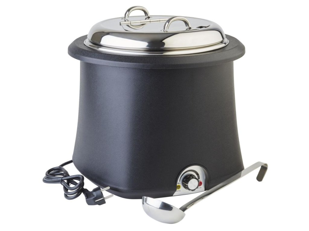 Tento elektrický kotlík v objemu 10 l je ideální vychytávkou pro ohřev i udržování teploty podávaných všelijakých polévek, ale také třeba různých omáček. Skvěle se hodí do gastro podniků a na akce, kde se podávají teplá jídla. Teplá polévka totiž představuje výborný předkrm před dalším jídlem, který uspokojí vaše zákazníky předtím, než sáhnou po dalších položkách z jídelního lístku. Dodává se s nerezovou vložkou, která udržuje teplotu tam, kde ji chcete mít. Obsahuje víko s dvojitou rukojetí a termostat pro vnitřní nastavení teploty. Zajistí, aby se polévka dobře prohřívala po dlouhou dobu.Kotlík na polévku elektrický 10 l, černý