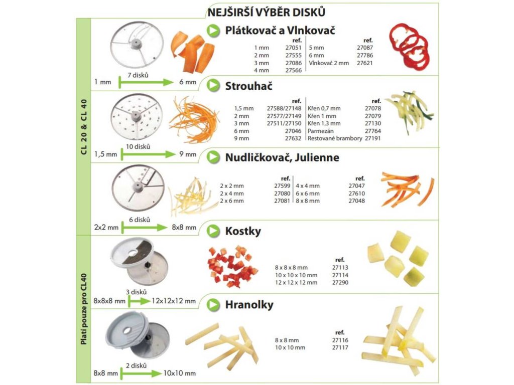 - 1984 W sada 6 disků – plátkovač 2 a 4 mm, strouhač 1,5 mm, nudličkovač 4×4 mm, kostičkovač 10×10×10 mm (2 disky – plátkovač + mřížka)