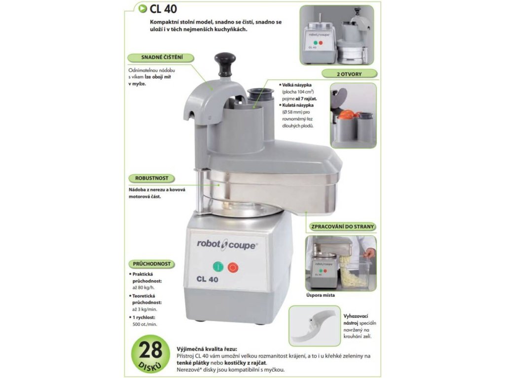 - určen pro menší gastronomické provozy s požadavkem na kvalitní a výkonné zpracování zeleniny