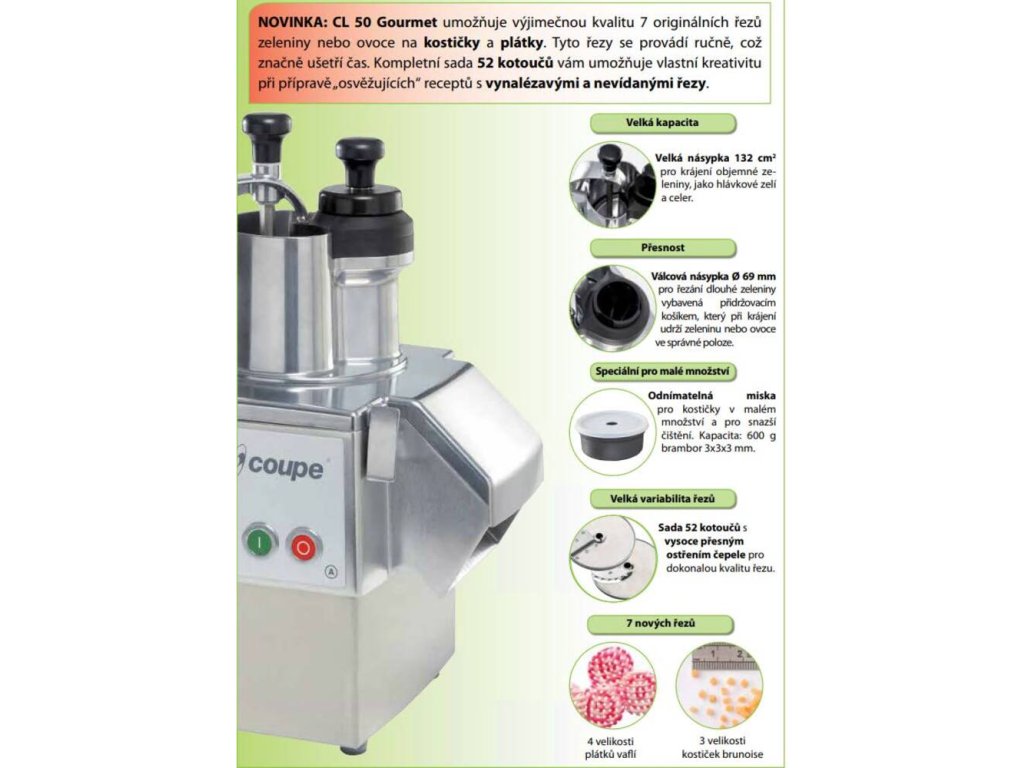 - určen pro provozy s vyšší gastronomií, s požadavkem na precizní a výkonné zpracování zeleniny