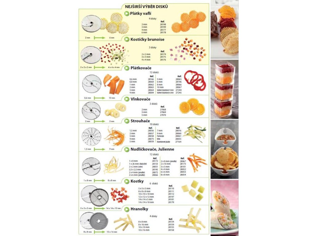 - plátkuje, vlnkuje, strouhá, nudličkuje, kostičkuje na velké a malé (brunoise) kousky, hranolkuje