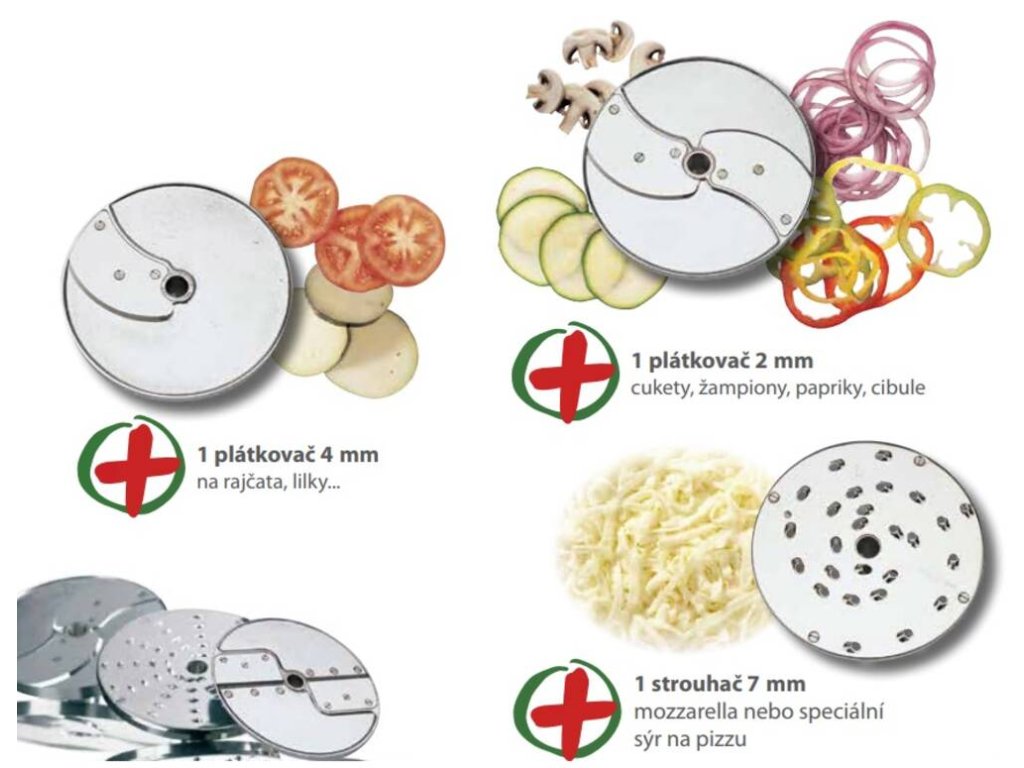 - zpracovává syrovou zeleninu, ovoce a na speciálních discích ořechy, parmezán, strouhanku, čokoládu, brambory, křen a mrkev