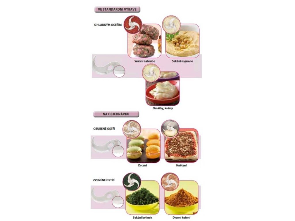 - nůž celonerezový s rovným ostřím (3 břity), nový tvar čepele, pro dokonalou homogenitu zpracovávaných surovin a optimální kvalitu řezu - vhodný pro přípravu emulzí, pěn, pomazánek, pro jemné i hrubé rozsekání masa a zeleniny