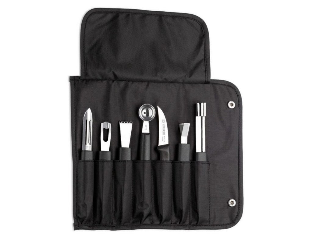 Sestava dekoračních nožů v praktickém pouzdře. Skvěle se hodí pro doladění estetického vzhledu vašich podávaných pokrmů. V sadě najdete 7 druhů různých nožů, díky kterým vymazlíte podávané pokrmy k dokonalosti. Připravíte neodolatelně vypadající zeleninovou oblohu a mnoho dalšího.Nože dekorační sestava