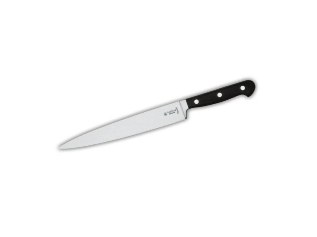 Kuchařský nůž od značky Giesser je symbolem dokonalé balance mezi mistrovsky naostřenou čepelí a rukojetí, která se pohodlně drží.Nůž kuchařský tenký 20 cm