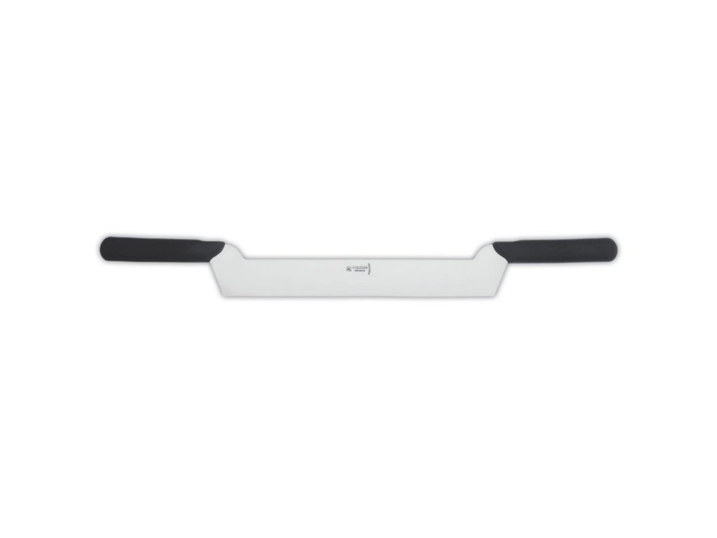 Nůž na sýr se dvěma rukojeťmi a délkou čepele 30 cm pomůže při krájení sýru. Vyrábí se v černém provedení se silným stabilním vroubkovaným ostřím.Nůž na sýr 30 cm, černý