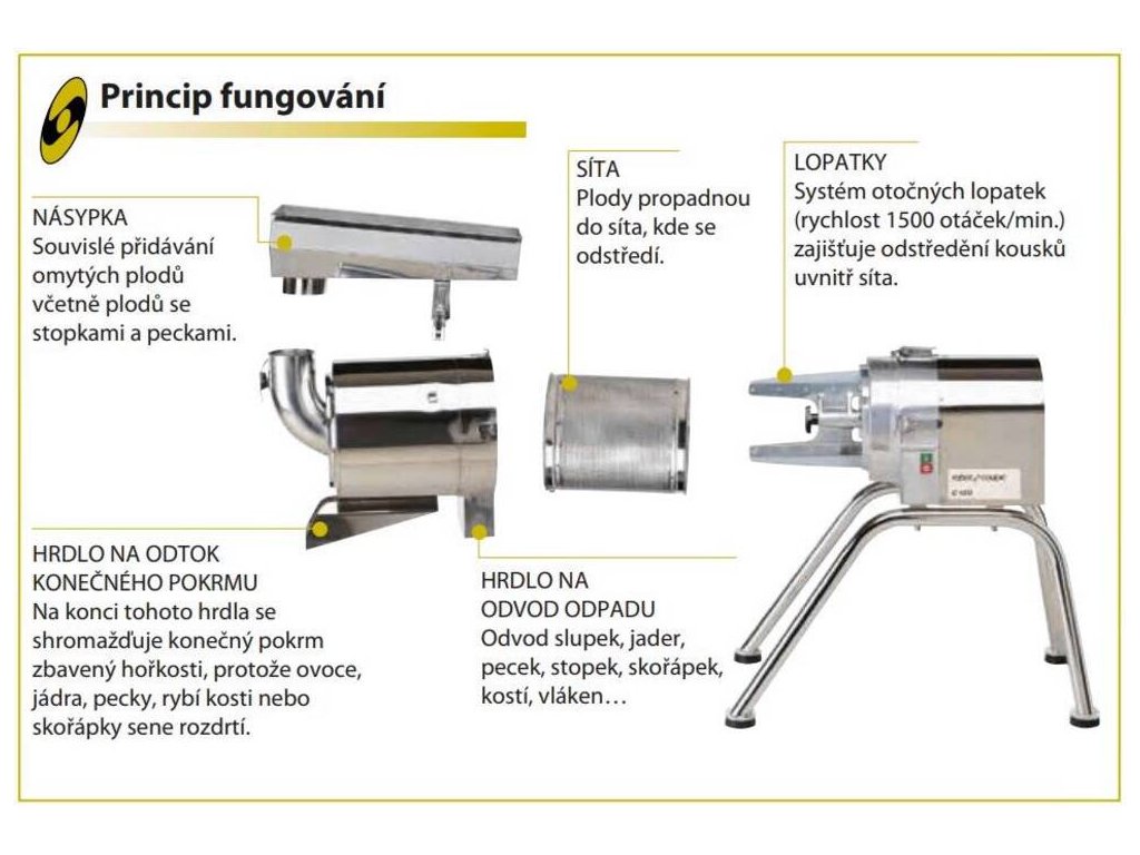 - odšťavňění je zajištěno sítem a gumovou pasírovací stěrkou, která zajišťuje získání maximálního množství dužiny nejen z bobulovin