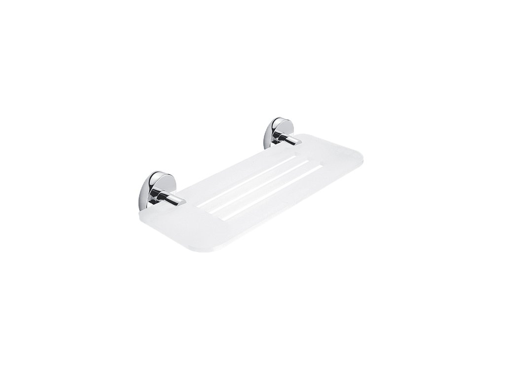 Police, 30 cm Police s frézovanými otvory. Materiál plexiglass s matovaným povrchem. Délka 30 cm. Úchyty mosaz/chrom.