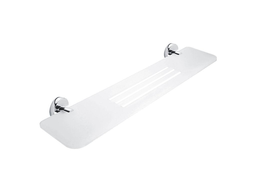 Police, 60 cm Police s frézovanými otvory. Materiál plexiglass s matovaným povrchem. Délka 60 cm. Úchyty mosaz/chrom.