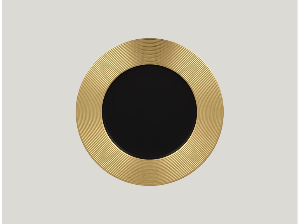 Porcelánový mělký talíř s kruhovým reliéfem ve zlatém dekoru a tajemně černým středem dodává vkusnou a elegantní atmosféru. Vaše hosty ohromí, zaujme a zpříjemní jim gastronomický zážitek. Prvotřídní porcelán zaručuje kromě svého atraktivního designu také svou odolnost a kvalitní zpracování.Mělký talíř