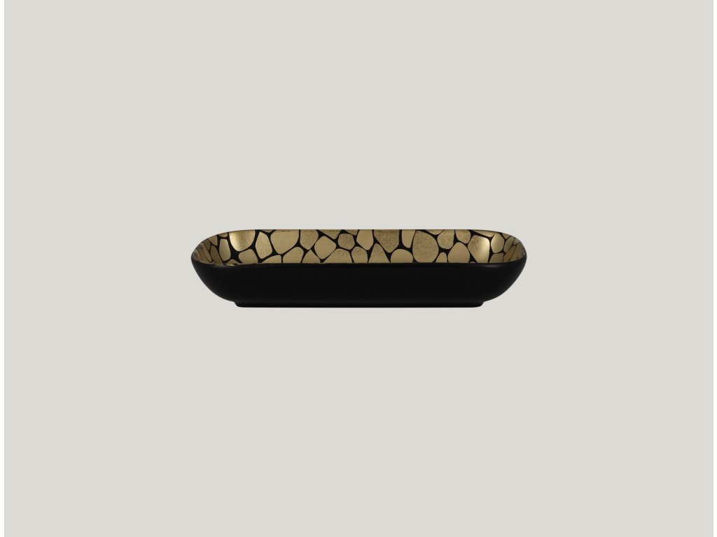Miska s designovým dekorem vykreslujícím oblázky, které připomínají tisíce zářících sluncí. Kombinace zlatočerné dodává na luxusní atmosféře, která potěší a povznese gastronomické prožitky do slastných výšin nebes. Kvalitně zpracovaný porcelán zaručuje odolnost a dlouhodobou živostnost. Misku využijete pro podávání vašeho kulinářského umění všeho druhu.Miska obdélná 22 × 11 cm