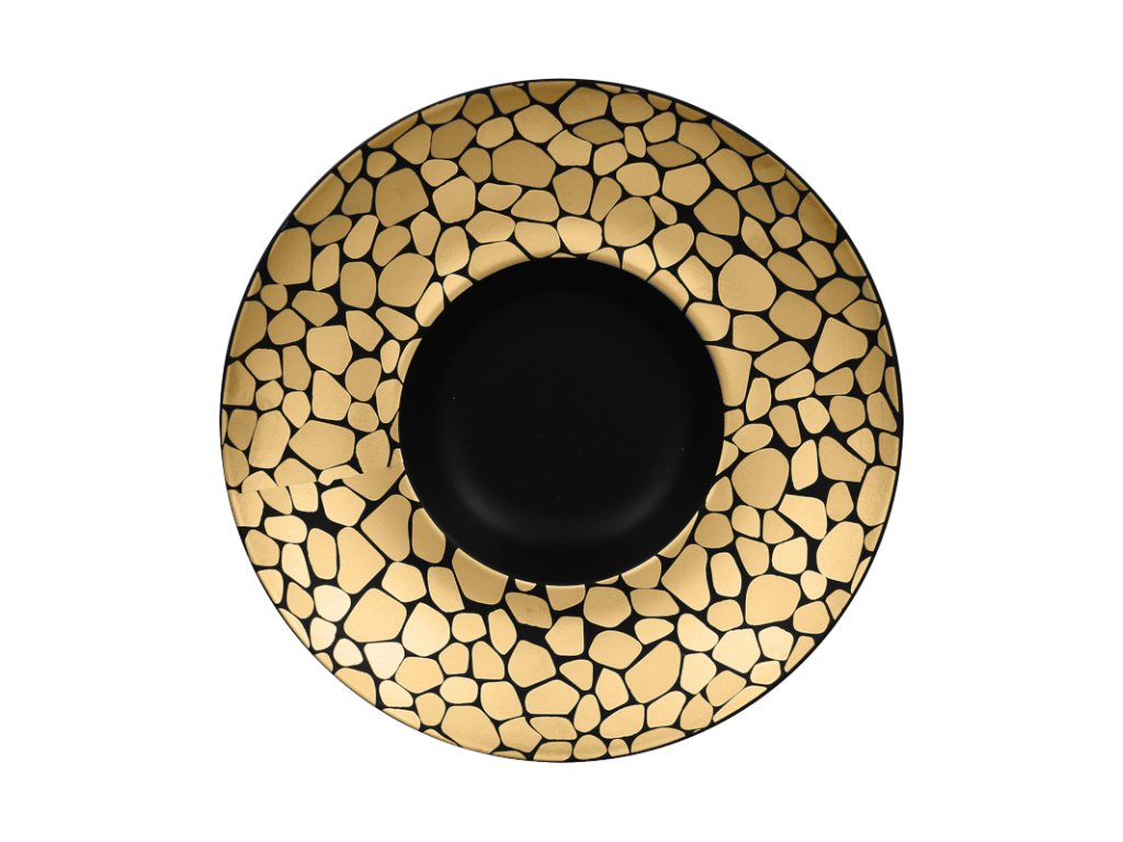 Mělký talíř s designovým dekorem vykreslujícím oblázky, které připomínají tisíce zářících sluncí. Kombinace zlatočerné dodává na luxusní atmosféře, která potěší a povznese gastronomické prožitky do slastných výšin nebes. Kvalitně zpracovaný porcelán zaručuje odolnost a dlouhodobou živostnost. Talíř využijete pro podávání vašeho kulinářského umění všeho druhu.Talíř mělký 29 cm