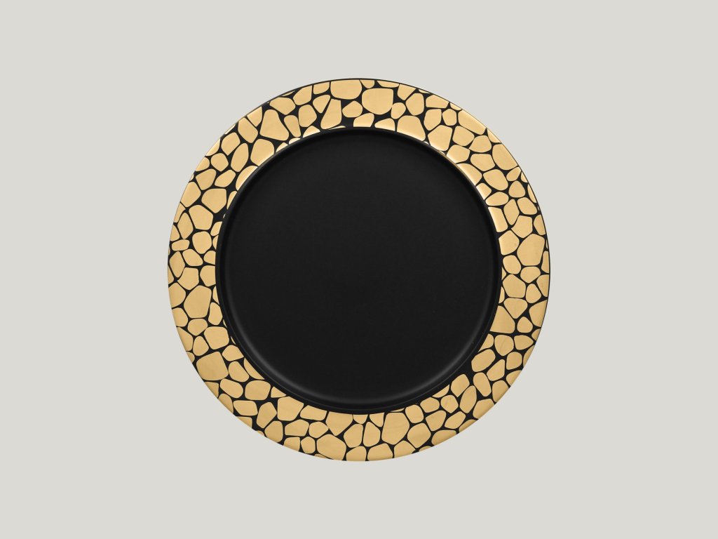 Mělký talíř s designovým dekorem vykreslujícím oblázky, které připomínají tisíce zářících sluncí. Kombinace zlatočerné dodává na luxusní atmosféře, která potěší a povznese gastronomické prožitky do slastných výšin nebes. Kvalitně zpracovaný porcelán zaručuje odolnost a dlouhodobou živostnost. Talíř využijete pro podávání vašeho kulinářského umění všeho druhu.Talíř mělký s okrajem 28 cm