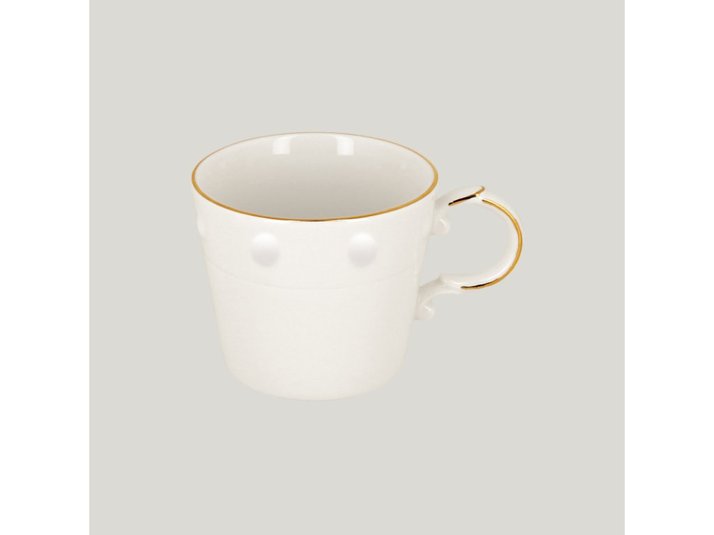 Tento hrnek dodává pocit luxusu díky propracovanému designu a také uvolňující nádech jako při pohledu na vycházející slunce. Bílé provedení se zlatým okrajem poskytuje parádní plátno pro servírování těch nejlepších kulinářských výtvorů. Kvalitní porcelán přispívá na kvalitě v podobě dlouhodobé životnosti a odolnosti proti poškození.Hrnek na čaj 21 cl