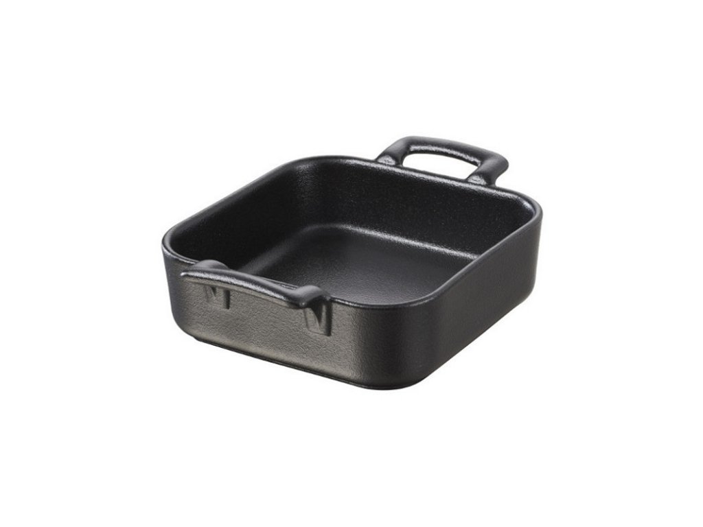Miniatures minipekáček představuje zmenšenou variantu běžných pekáčů. Perfektně se hodí k servírování ochutnávek zapékaných jídel nebo kompletních pokrmů. S čistým svědomím ho můžete dát do myčky, trouby i do mrazáku. Minipekáček s úchyty tvoří monoblok, a proto zaručuje špičkovou pevnost.Minipekáček 13 × 13 cm, černý