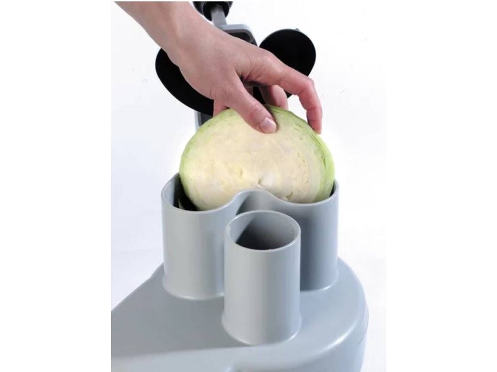- 1× velký otvor ve tvaru ledvinky o ploše 104 cm2 – objem násypky 1,6 l – určen ke krouhání větších kusů zeleniny – jako je zelí, cibule nebo rajčata