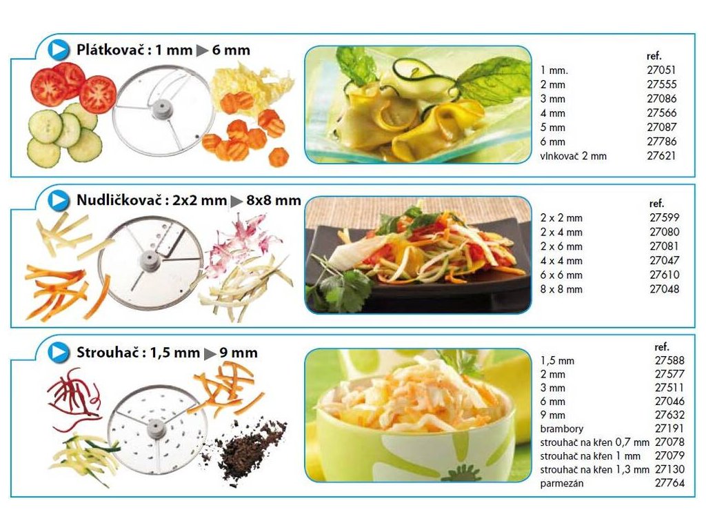 - 1981 sada 4 disků – plátkovač 1 a 3 mm, strouhač 1,5 mm, nudličkovač 4×4 mm