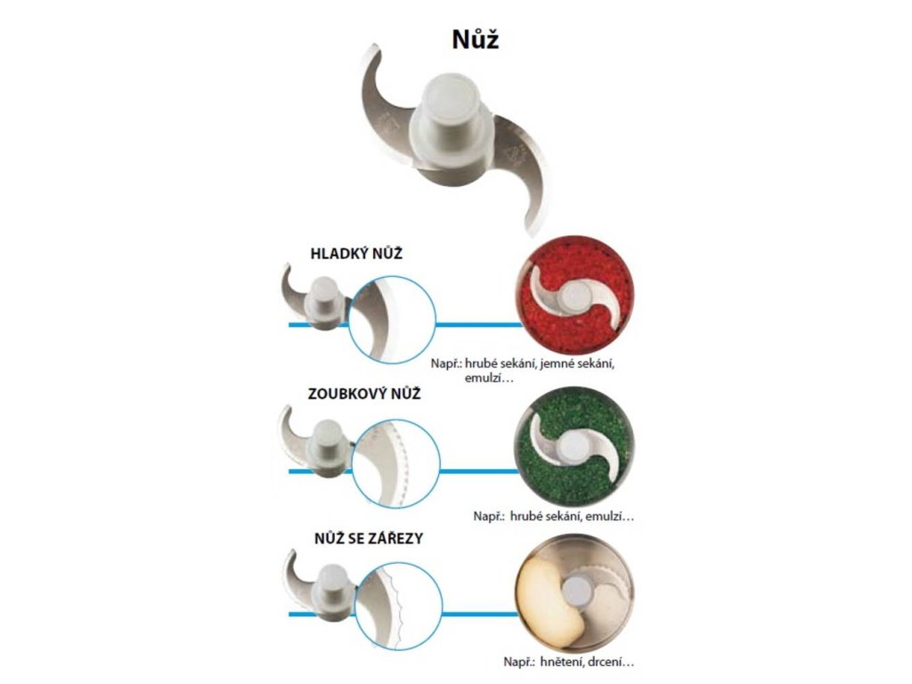 - lze v ní sekat maso, zeleninu, mandle, oříšky, koření, připravovat majonézu, pyré, protlaky, pomazánky, strouhanku a hnětat těsto