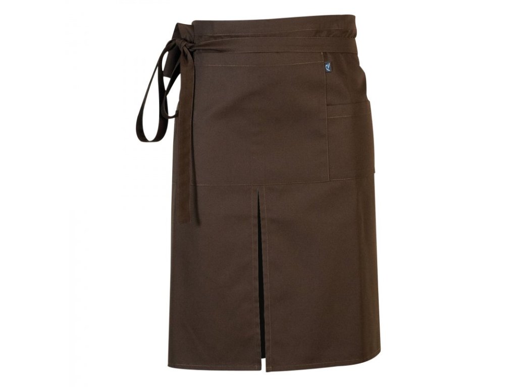 Tato zástěra představuje dokonalý kousek do každého gastronomického podniku, neboť vypadá stylově. Navíc díky šikovným kapsám (3 – 1 větší uprostřed, 2 menší na bocích) je praktickým kouskem pro každodenní práci v profesionální gastronomii. Zavazuje se v pase a má přední rozparek pro lepší volnost pohybu. Lze ji prát v pračkách.Zástěra kolem pasu, hnědá