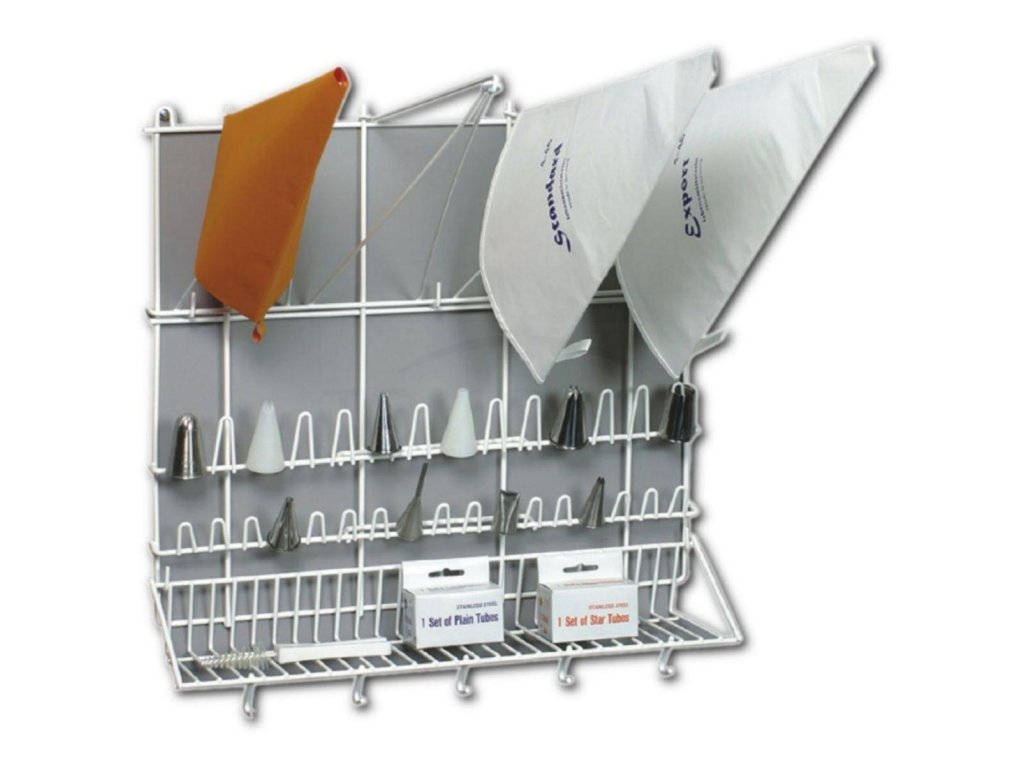 Dovedli jste své cukrářské dílo k dokonalosti a potřebujete místo, kam uskladnit náčiní? V tom případě vás rozhodně zaujme náš nerezový stojan. Jeho konstrukce je stabilní a najdete na ní 4 háky na pytlíky, 31 háčků na koncovky, poličku a 5 svislých háčků. Při dalším pečení budete mít vše po ruce a nemusíte prohledávat šuplíky, abyste našli to, co hledáte.Stojan na pytlíky a koncovky 50 × 50 cm