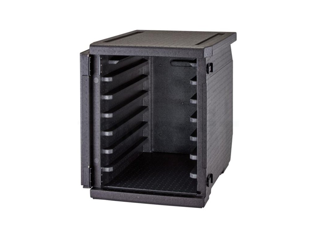 Termobox s předním plněním a 9 kolejnicemi renomovaného výrobce CAMBRO je jedním z nejlepších produktů pro přepravu pokrmů na trhu. Boxy vynikají svou odolností, lehkostí a disponují 9 vestavěnými kolejnicemi, které nelze rozšířit ani vyjmout. Kolejnice jsou přizpůsobeny pro plechy 60 × 40 cm a mají mezeru 3,5 cm. Vestavěné rukojeti v horní části boxu ve spojení s plně otevíratelnými dvířky (270°) zajišťují jednoduchou manipulaci i nakládku a vykládku pokrmů. Termoboxy jsou stohovatelné, odolné vůči mastnotě či chemikáliím a můžete je mýt v myčce nádobí. Lze je použít i s ohřívacími a chladícími vložkami, které se vkládají na zadní stranu boxu, což zabraňuje odkapávání kondenzované vody na pokrmy a zároveň zajišťuje rovnoměrné rozložení tepla či chladu v celém boxu.Termobox s předním plněním a 9 kolejnicemi