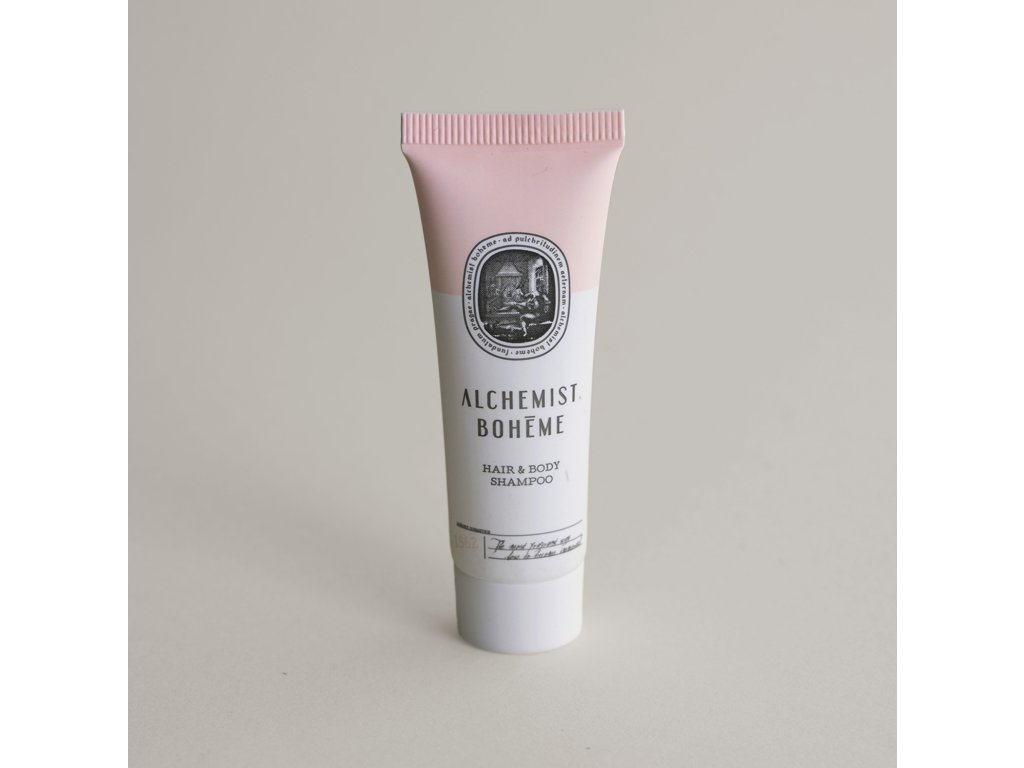 VLASOVÝ A TĚLOVÝ ŠAMPON ALCHEMIST BOHÉME 1562 (20 ml) Ukažte svým hostům kvalitu českých lázeňských služeb prostřednictvím lokální kosmetiky inspirované alchymistickou dobou i nároky moderního světa.Vlasový a tělový šampon z řady české značky Alchemist Bohéme je přizpůsobený k mytí vlasů a pokožky celého těla. Svou recepturou, která se zakládá na mátovém esenciálním oleji, čerpá z moudrosti českých bylinkářů. Díky ní má jemnou svěží vůni, kterou povzbudí mysl i tělo. Šampon najdete v ekologické tubičce o objemu 20 ml. Kosmetická řada Alchemist Bohéme je inspirovaná historickými herbáři a najdete ji v ekologických obalech. Plastové části obalů obsahují technologii d2W, která promění běžný plast na konci jeho životnosti na biologicky odbouratelný materiál a urychlí jeho rozklad. Krabička je z recyklovaného papíru, který pochází z kontrolovaného ekologického zemědělství s certifikátem FSC. Produkty neobsahují škodlivé látky, jako jsou parabeny, ani silikony a nejsou testovány na zvířatech.Chtěli byste do produktů Alchemist Bohéme vnést vlastní invenci a vytvořit jim originální vůni na míru vašemu hotelu? Rádi vám ji ve spolupráci s českou parfumérskou značkou Voniak připravíme. Kontaktujte nás! Minimální objednávka: 50 ks / malý karton nebo 200 ks / velký karton Doprava: ZDARMA u objednávek nad 5 000 Kč bez DPHDoplňkové parametry